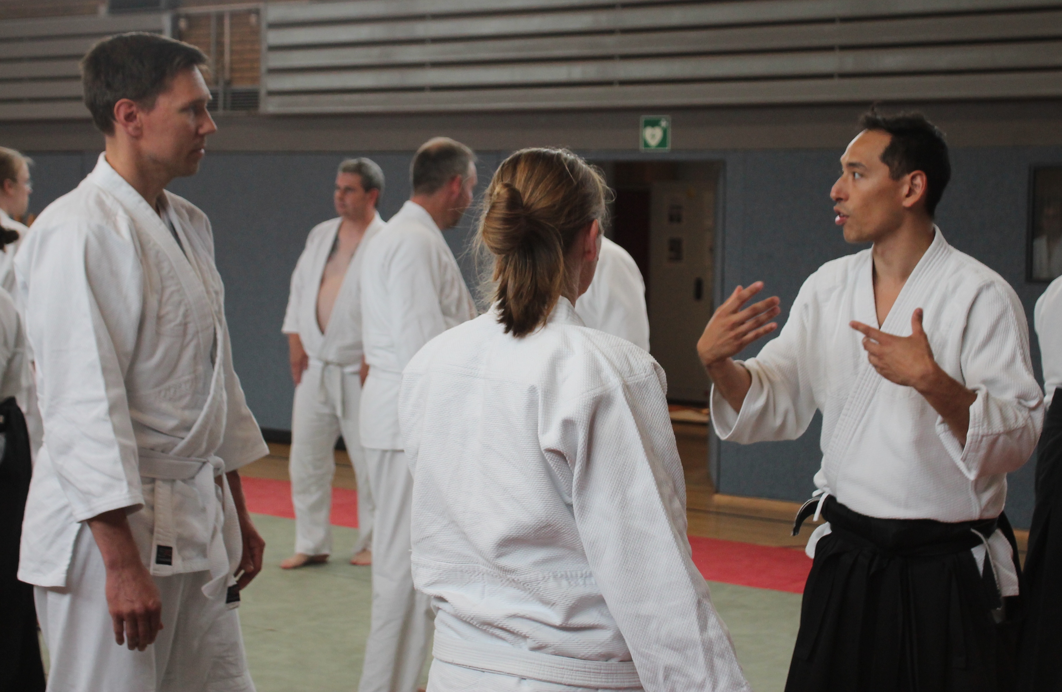 Das Training selbst war sehr strukturiert aufgebaut. Von den Basisübungen ging es über die verschiedenen Möglichkeiten des Ausweichens bei einem Angriff bis hin zu einfachen und auch komplexeren Aikidotechniken. Auch der Umgang mit dem Stab („Jo“) und dem Holzschwert („Bokken“) wurde unterrichtet.
