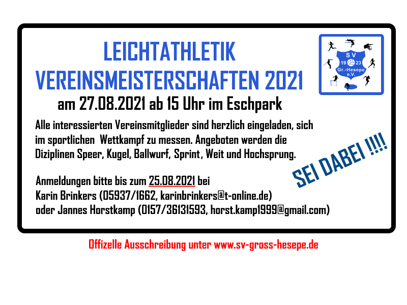 Anmeldlungen bitte an Karin Brinkers (05937/1662 o. karinbrinkers@t-online.de) oder Jannes Horstkamp (0157/36131593 o. horst.kamp1999@gmail.com)
